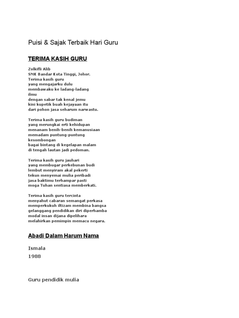 Taurus Sifat Romantis Akan Mendominasi Besok Virgo Menarik dari Lingkungan Libra Jadi Hari Keberuntunganmu Cek yang Lainnya. Pastinya puisi tersebut memiliki makna mendalam dan bisa memberi kesan tersendiri bagi mereka. Bahkan mereka rela mencerdaskan anak bangsa meskipun jasanya tak pernah dipandang.