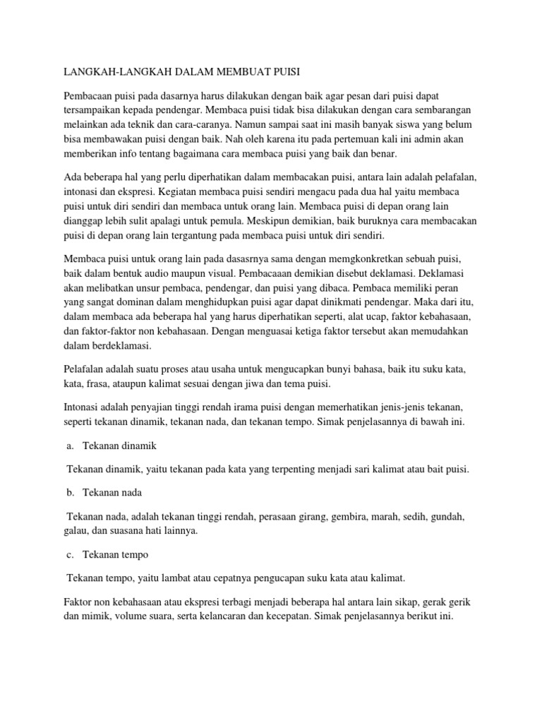 Semua itu tidak bisa dikesampingkan. Inilah 4 hal yang harus diperhatikan ini tergolong ke dalam aspek berbahasa yang reseptif. Info terbaru cara membaca puisi dengan lafal dan intonasi yang tepat puisi adalah salahsatu jenis sastra yang bahasa didalamnya terikat oleh rima irama serta penyusunan larik dan bait.
