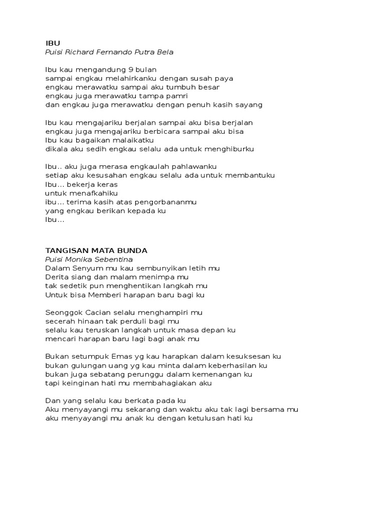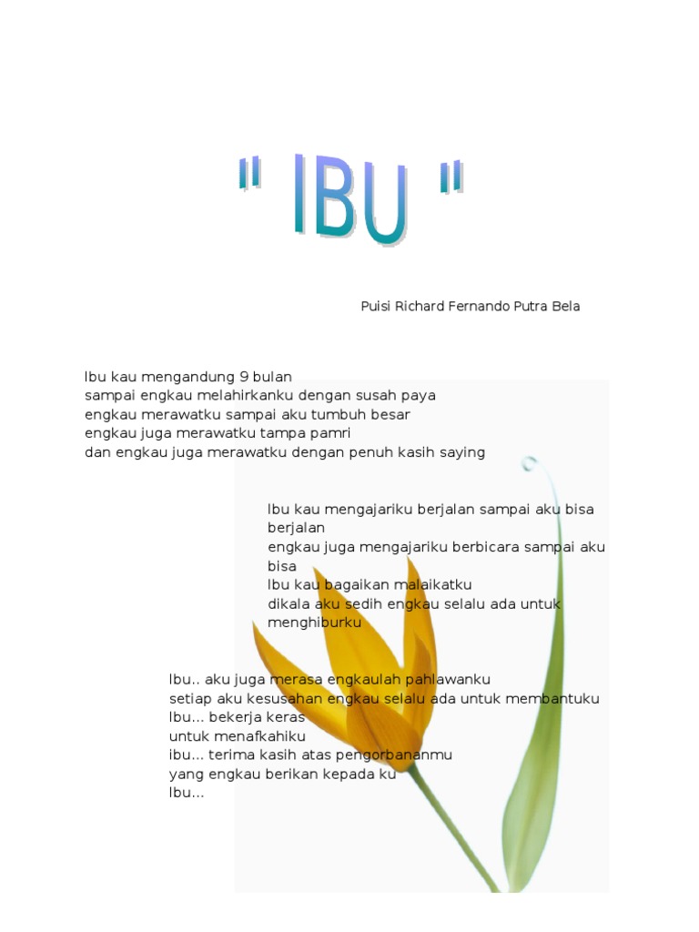 Dec 07 2020 Puisi diatas menggambarkan kasih ibu yang sepanjang masa. Semua orang terlahir dari rahim seorang ibu. May 22 2013 Puisi Richard Fernando Putra Bela Ibu kau mengandung 9 bulan sampai engkau melahirkanku dengan susah paya engkau merawatku sampai aku tumbuh besar engkau juga merawatku tampa pamri dan engkau juga merawatku dengan penuh kasih sayang Ibu kau mengajariku berjalan sampai aku bisa berjalan engkau juga mengajariku berbicara sampai aku bisa Ibu.