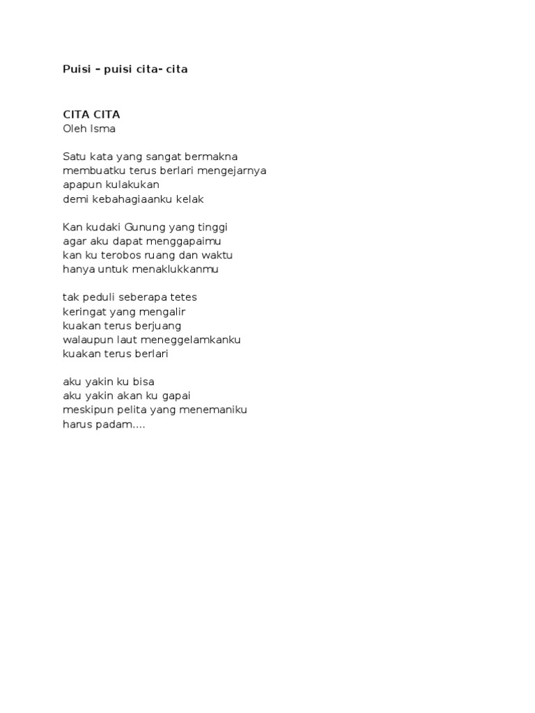 Buatlah sebuah puisi tentang cita citaku. Salinlah puisi tersebut di dalam buku tulismu. 7 contoh puisi tentang mimpi dan cita cita dalam bahasa inggris dan artinya sahabat sbi sedang mencari referensi puisi bahasa inggris tentang mimpi dan cita cita. 2 1 cita citaku menjadi dokter dari kecil aku bercita cita ingin sekali menjadi dokter.