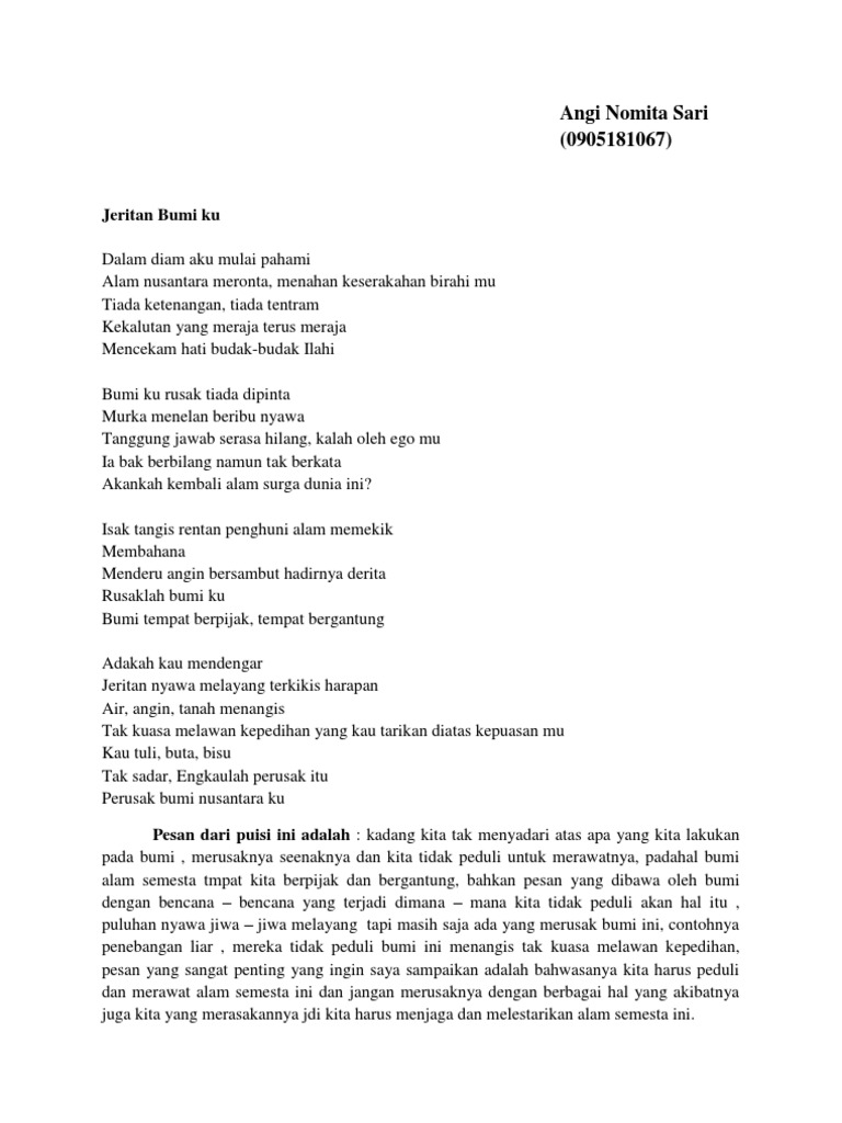Puisi sendiri dibuat dengan bahasa yang indah dimana di dalamnya terkandung beberapa hal seperti. Bumiku menangis merupakan satu dari tiga puisi tentang bumi atau puisi lingkungan alam yang diupdate untuk kesempatan ini adapun masing masing judul puisinya antara lain. 22 Maret 2020 0919 Diperbarui.