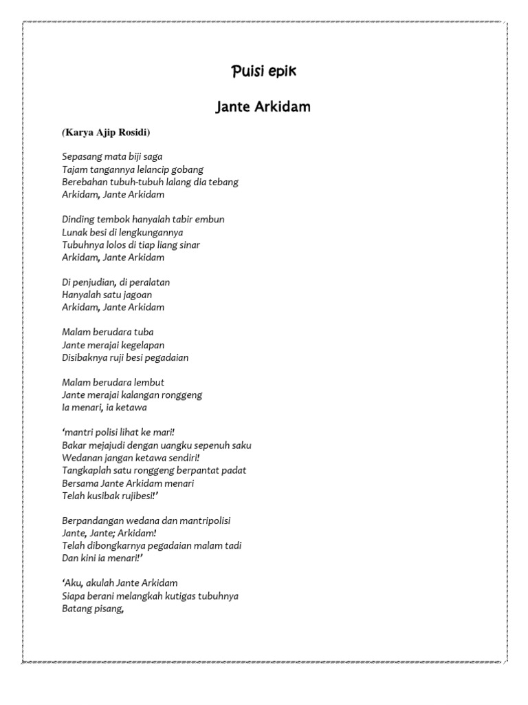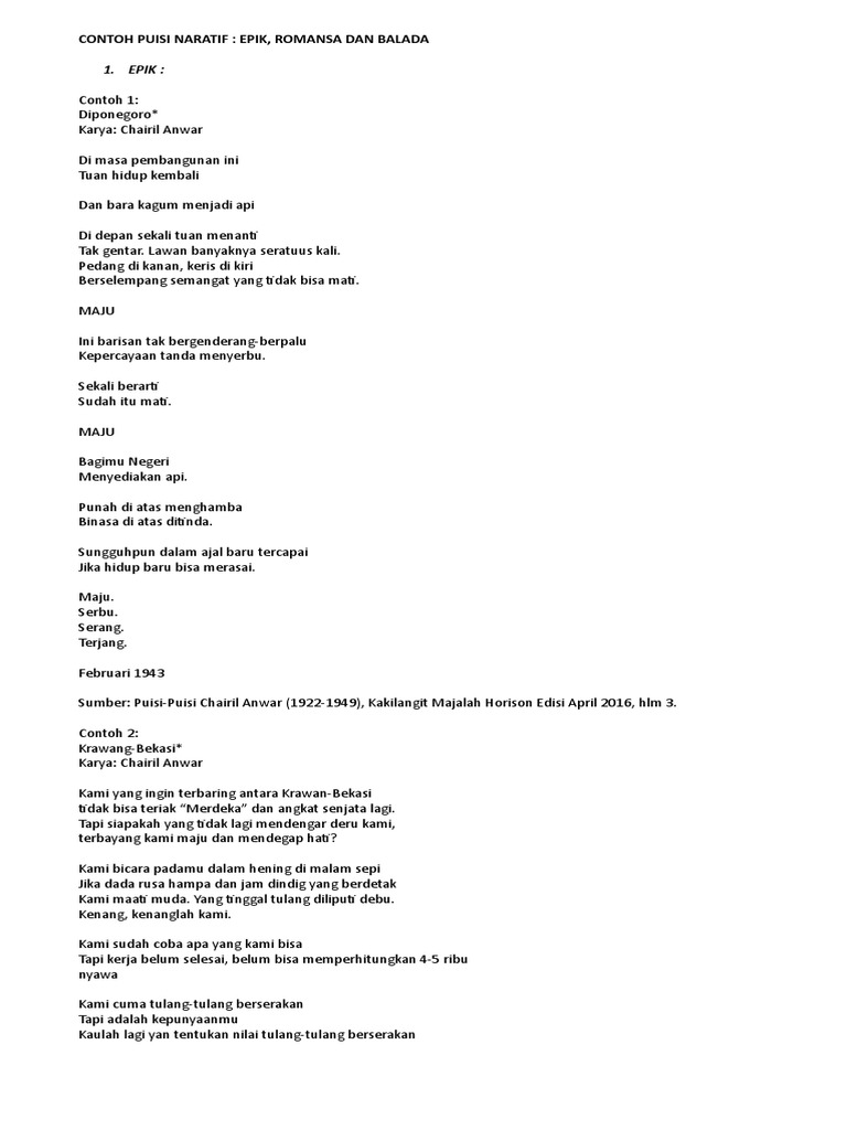 Mayat berjuang diantara sampah yang terbuang. Puisi ajip rosidi yang berjudul jante arkidam dan beberapa puisi rendra dalam balada orang orang tercinta merupakan contoh puisi epik puisi chairil anwar dan puisi puisi yang bertebaran di kompasiana lebih dominan berbentuk puisi lirik. Puisi balada adalah salah satu jenis puisi baru yang bersifat objektif yang menggambarkan perilaku seseorang lain lewat dialog maupun monolog sehinga mengandung gambaran kisah tertentu.