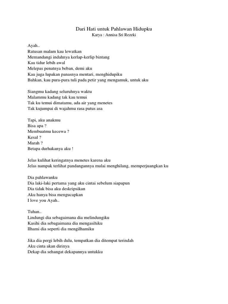 Ketujuh puisi kehidupan di atas memiliki makna yang sangat mendalam. May 12 2020 Ayah merupakan sosok pahlawan dalam keluarga yang setiap hari banting tulang bekerja keras kelelahan dan penat demi mencari sesuap nasi agar anak dan istrinya bisa terus hidup. Sep 09 2019 Kamu juga bisa mengiriminya puisi atau kata-kata manis yang barangkali bisa menyentuh hatinya sebagai ungkapan terima kasih atas jasa-jasanya terhadapmu selama ini.